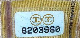 Image provided by Smoothoprter Chanel Series 6: [image needed] Chanel Series 7: [image needed] Image of "8" series: This is an example of the gold flakes or specks that should cover the sticker of an authentic Chanel hologram sticker. However it is also important to note that the gold flecks can wear off in time, due to excessive wear and tear. This picture also demonstrates the CHANELCHANELCHANEL logo located on the right side of the serial number. Also, the correct criss-cross slices in the secondary white sticker are also very clear. Also note the dark vertical line to the left of the sticker.