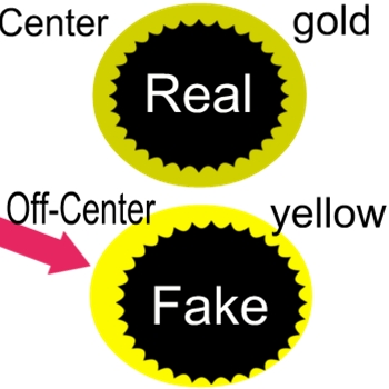 Note: Two images above, the real and the fake, at first glance do not appear to be that different. But when the details are scrutinized with greater intensity, the imperfections of the fake sunglass package begin to surface. The logo on the fake box does not look too bad when compared to the real box. But what we are focusing on in this picture is the sticker. The G-15 sticker is off-centered and the incorrect color. When comparing the colors, the real sticker has a gold hue, like a foil, and the fake sticker has more of a standard yellow color. However, depending on the picture, the real sticker may appear bright yellow. And also some real stickers may actually have a more yellow tint to them, so the color is secondary to the next point: The emblem is off-center. Below is a diagram of the real vs. fake sticker.