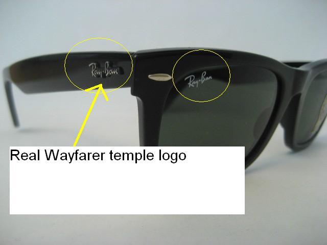 Below is an image of an authentic Wayfarer temple logo: Notice how the logo is part of the frame, and is poking out equally everywhere. There is no uneven levels like the fake logo (above). And it is not poking out to far in places like the fake temple logo (two above). Also, you can get a good look at the lens stamp, and see how the positions are all relative to each other. Also, if you look at the fake glasses (above), you will notice that the lens stamp is on the wrong lens! Another intersesting detail is the way the real Wayfarer glasses seem to lean. The lenses seem to have a foreword slant, whereas the fake glasses seem to stand more upright.